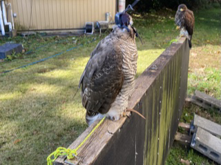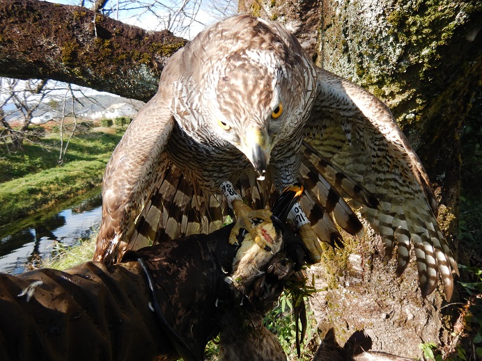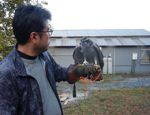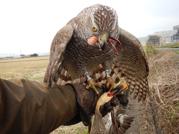 良いとこなしな上に、最後の所ではかなりやばかった! 珍しく細い用水に数羽のカルガモが居て、斜め立ちした所に因を羽合せ!! 1羽に羽合せがきまり、掴んで落ちた。 しかし、フェンスに上から直撃し、因は手前、カルガモは、向こう側・・・ カルガモは、そのまま飛んで行くのかと思いきや、ジタバタしてる状態。 すぐに因を呼ぶが、そう言うときに限って戻りが悪い。 因はフェンス向こうのカルガモに気づいた様子。 カルガモが動いて見失った瞬間、拳に戻ったので、すぐにフェンス裏へ・・・・ カルガモは、飛び上がれないようで、そのまま因が押さえました。 どうも翼が折れたようです。