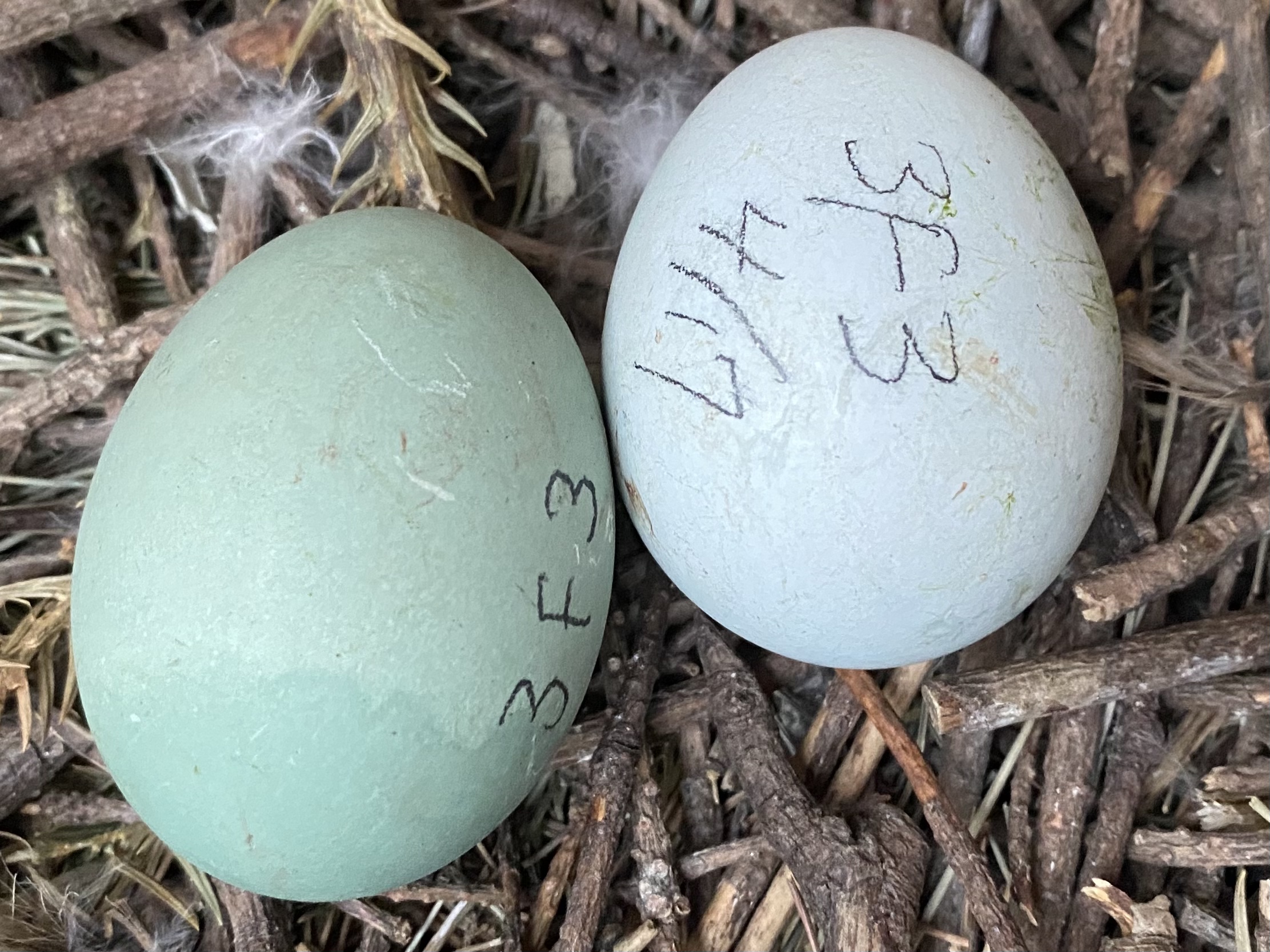 となりの卵は蒼い!? 二日前から卵が確認出来ていた「お客さんから預かっている 」オオタカ “ フィニッシュ ”のメスがやっと産卵!・・・・と言うか、今朝見に行くと産んでいました。先日産んだ卵と比べるとずいぶん青い!!※サブタイトルで「蒼い」を使ったのはワザとです。オオタカの人工授精は、紆余曲折!今は「産んだ!産んだ!!」と喜んでいるが、この後は「孵らん!」「育たん!」と、苦しむのは目に見えている!!