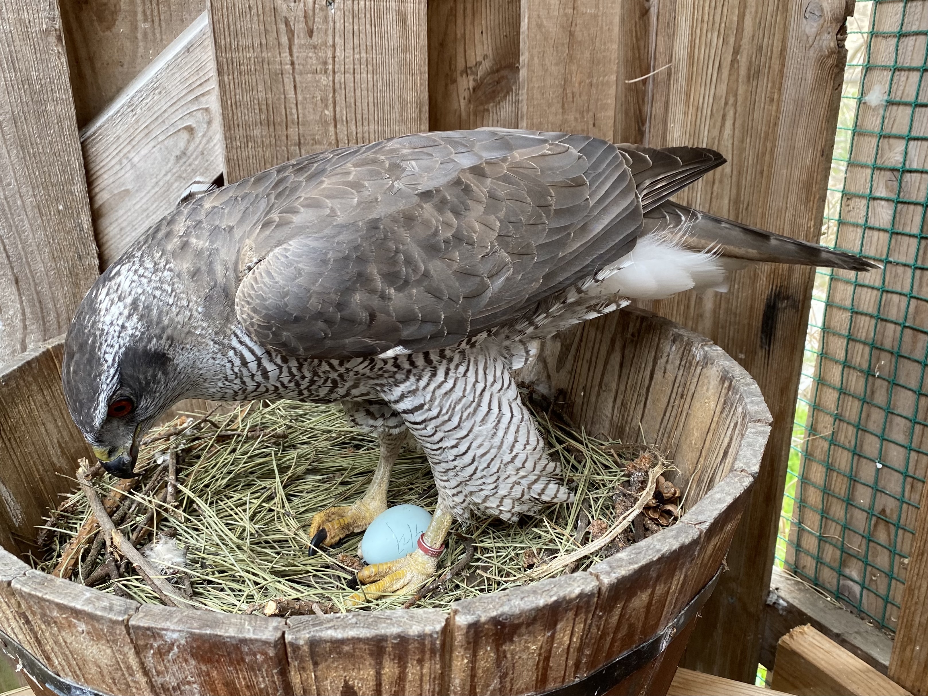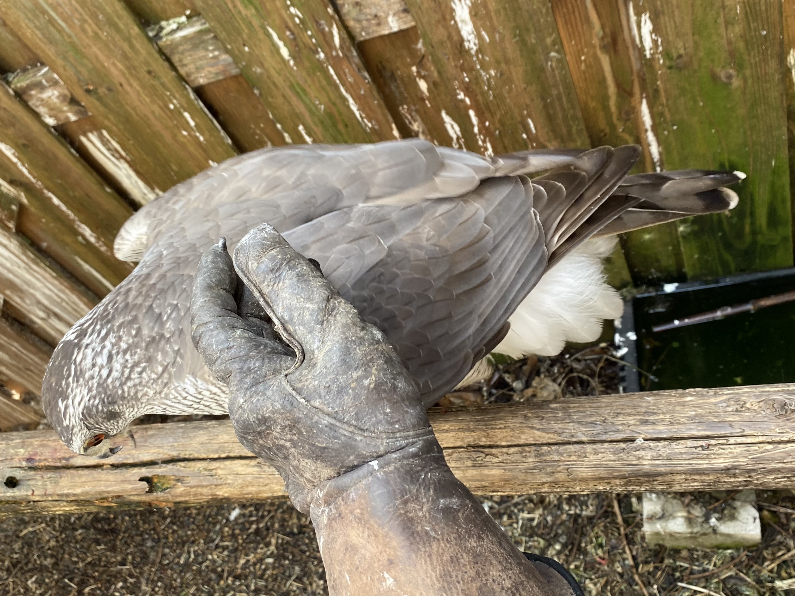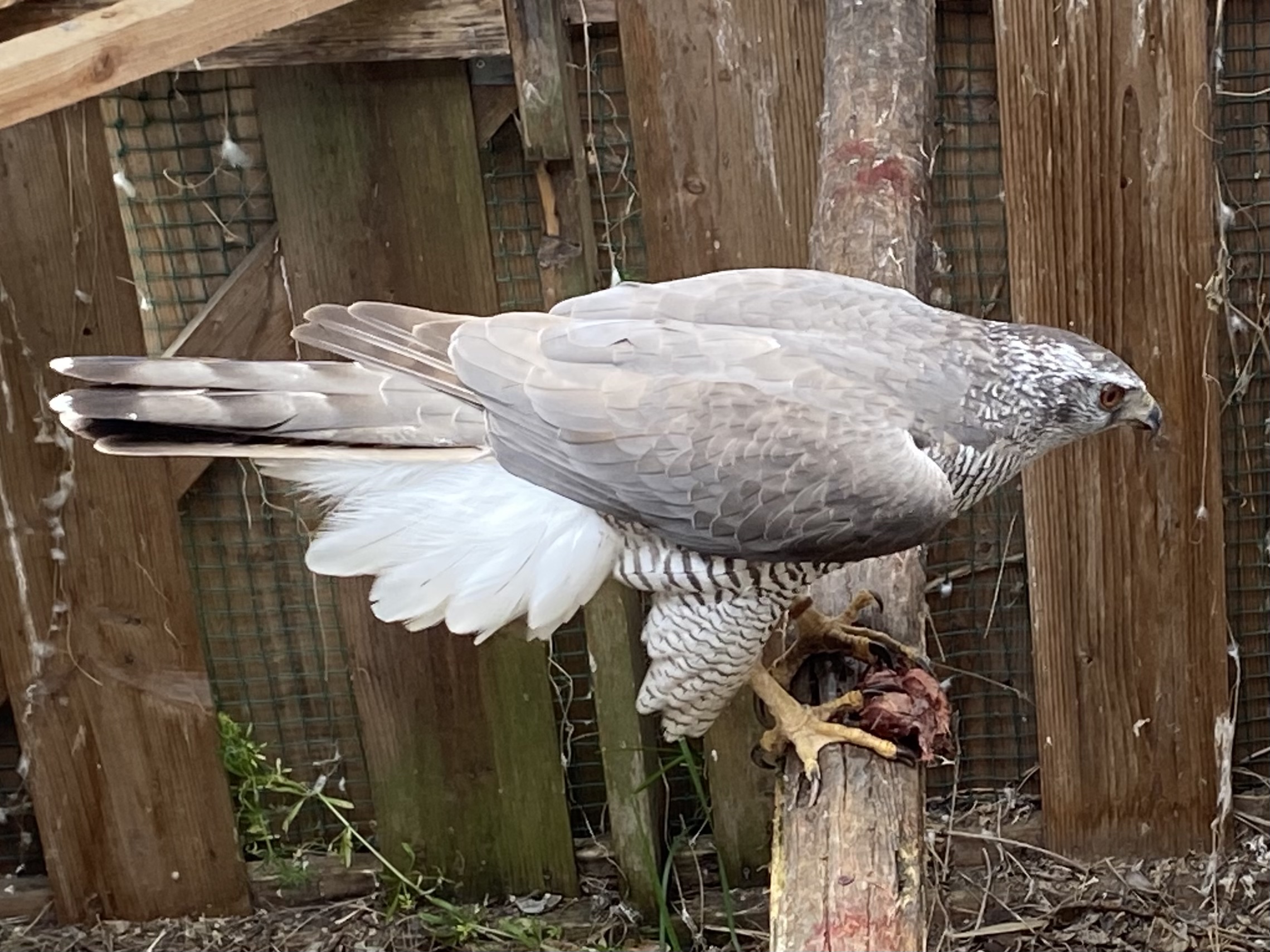 お客さんから預かっているオオタカ “ フィニッシュ ” のメス! 怪我から嘴が曲がってしまっています。 また「身寄り/みより」の「返籠/かえるこ」も曲がりが弱く直線的にはえています。 そんなこんなで調教には使われなくなった個体です。