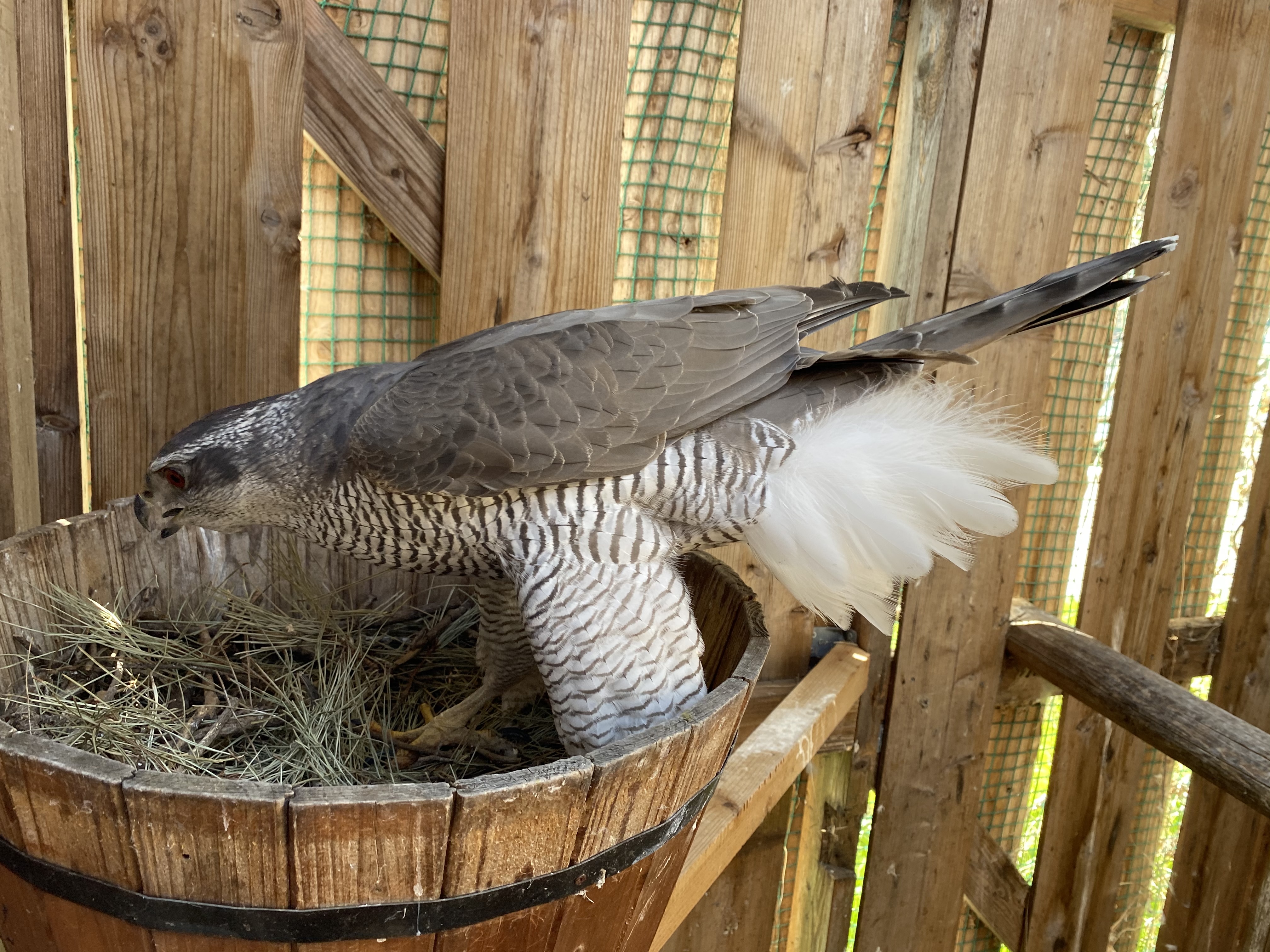 オオタカ“フィニッシュ”(2012年生・イギリスブリード・オス)の2羽居るうちの白っぽい個体。 特にシロオオタカ混じりと確信がある訳ではなかったのですが、もう1羽が黒っぽい個体(こっちも出戻り)だったので・・・・今、あらためて見るとフィニッシュかな・・・と! 私が輸入し販売した個体ですが、昨年の春にお客さんでもありますし、会員ではないんですが同じ放鷹術にかかわる仲間と言うか友人と言うか、仲良くさせてもらっている方から、預かりました。