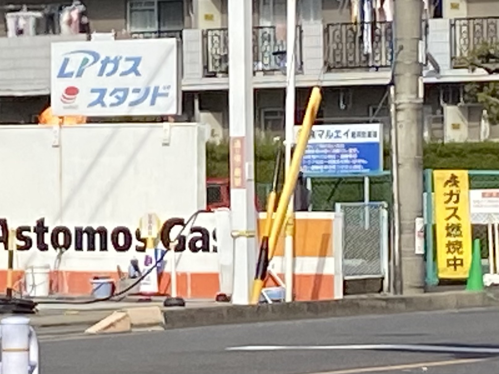 こういうのするんすね!? ガソリンスタンド(実際には、ガススタンド?)の後ろで、炎が上がっている!?大丈夫なんけ?と思ったら、横に看板が・・・