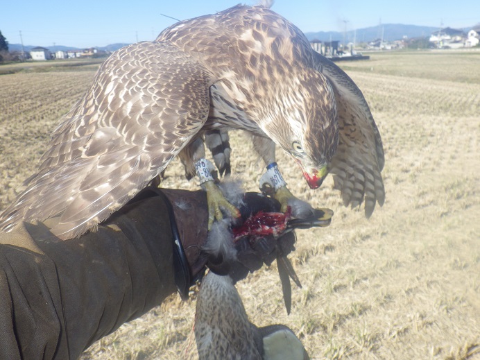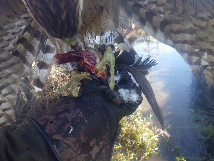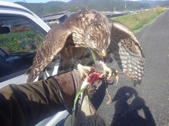 今日も出ました。 私の場合、毎日の据え回しや渡りの仕込みが、事実上・・・実猟になるだけ・・・ せっかく獲ったのに、オオタカは口餌でご満悦ですが・・・カルガモは、据上げ後に手を滑らせて、落としてしまい逃げられちゃった!!