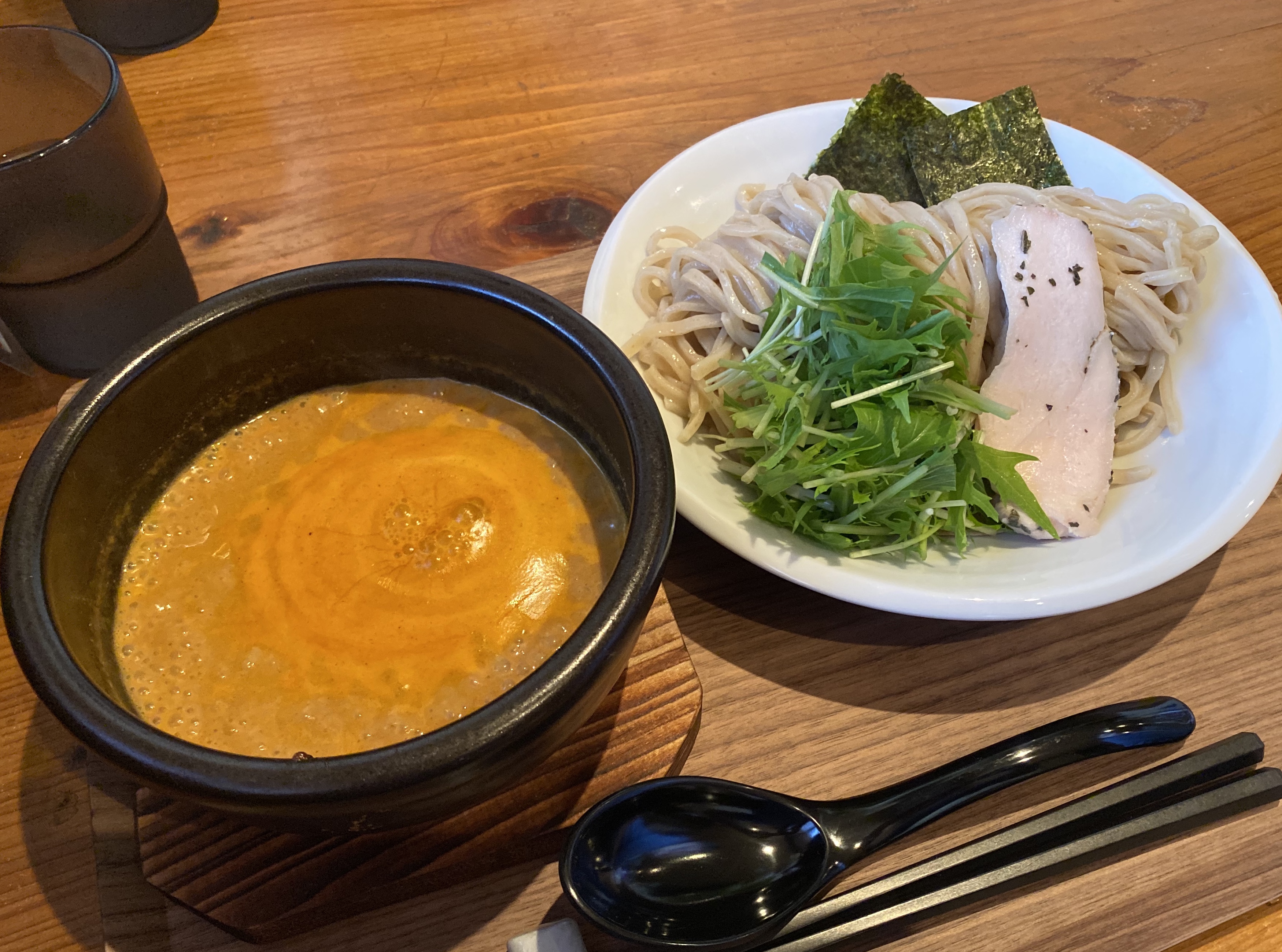 大谷会員が昼飯込みで来店! 数日前から気になっていた「ヌードル◯和 岐◯本店」へ・・・二枚看板メニューの「濃厚オマール海老のカレーつけ麺」¥900を頂いてきました!! いやぁ、これは美味い!! めちゃめちゃオマール海老の(海老は分かるが、他種の海老と判別できる鼻、舌は持ち合わせておりません!?たぶん・・・)良い香り、クリーミーで濃厚で、カレーも強すぎない、これはかなり好みです!! 麺も美味いし・・・・ フォアグラ¥400のトッピングに後ろ髪を引かれましたが、ここは我慢して・・・