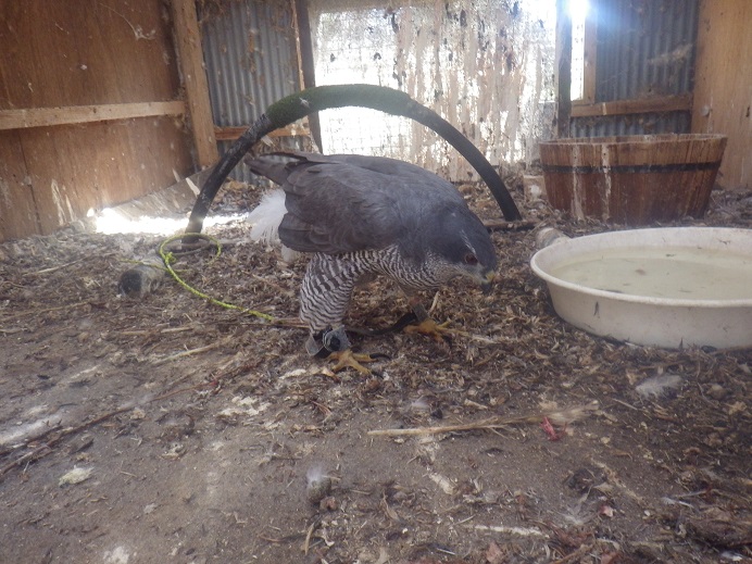 GBスパ(オオタカ×ブラックスパロウホーク)のメスが産卵! 2010年生まれで、卵は何年か産んでいたのですが、小屋に放すと産まなくなり、繋ぎ直して、3年後の去年、再び産み始めました。 ですが、昨年はオスが終ってしまい、間に合わず・・・ その後もダラダラ発情が続きで、今年は早く発情しました。 上手く孵化、育雛まで行けると良いのですが・・・・
