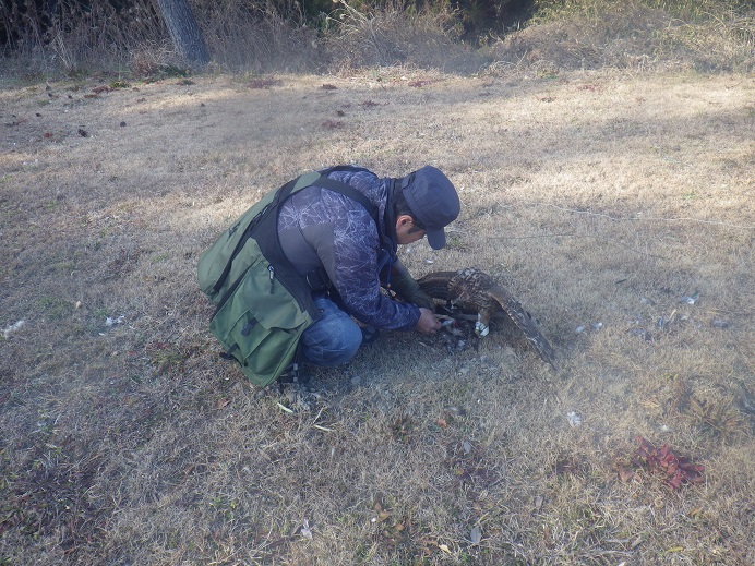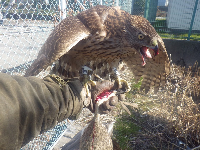 大谷会員のオオタカ オオタカを、見てほしいとのことで来店!振鳩もしたいと言うことで、午前中に獲ったコガモが生きているので当てることに・・調教の進行スピードは遅めですが、まあまあ素直に調教されているようです。