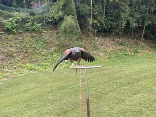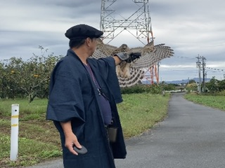 ちなみに着ているのは鷹匠装束ではなく、ただの着物。 リサイクルショップで買ったもので、着物と羽織(対もしくはアンサンブルと言うそうな)で\2000〜¥3000程度(2対購入)のものです。 鷹匠補研修会なんかで会員に着てもらったり、装束仕込の前(つもり)に雑に着れるのでもってこい。