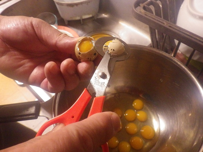 台風は???? 朝から曇って入るものの雨は降っていない!!エサやりを終え、仕入れに出る!!心配された台風は?給油時にびしょ濡れ覚悟だったんですが・・・・そんな心配は要らず・・・・仕入先に到着寸前、別の仕入れ先から準備ができた連絡を・・・ついでに回ってきました!!ちなみに写真はウズラ卵専用のはさみ「うずらの卵切り」!!