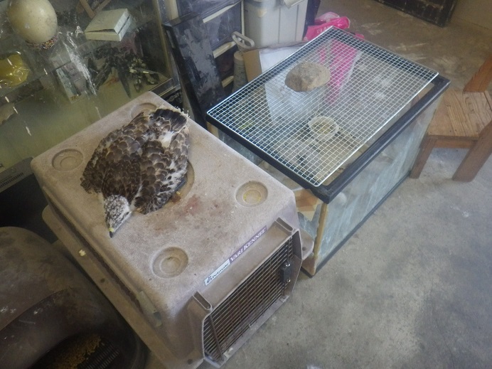 気分を変えて・・・ 放って置いたらウチ(ふん)だらけになるので、下チビ達からクレームが・・・仕方ないので、店の中に絨毯敷いて、補修したボウパーチを設置!フィニッシュ メスを繋ぎました・・・・