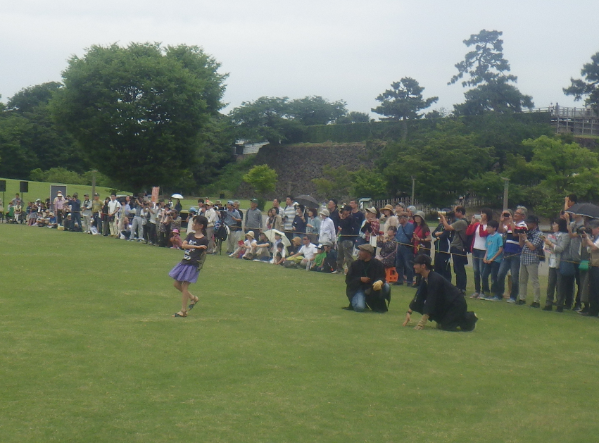 昨日の行列参加に続いて本日は金沢城での実演です。 冬のおもてなし事業とは違い、今回は新丸広場にて行います。 時期的にオオタカは実演用に引っ張っていた吉田鷹匠の鳥のみですので、ほぼハリスホークのみ・・・ ですが、あれこれ工夫を行い・・・・