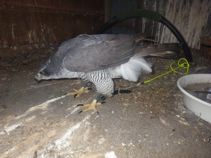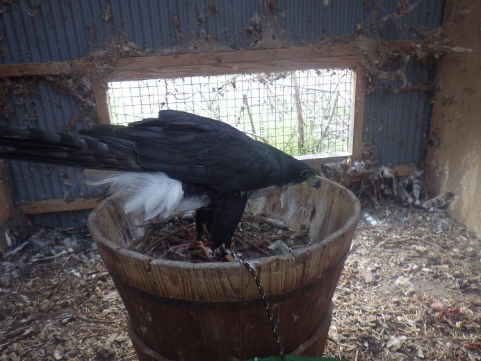 ブラックスパロウホーク ・・・苦しそう!?波多野鷹匠に言わせるとブラックスパは難産型だそうで、体型の割に(単純な体の大きさではない)卵がでかいので、卵を産むのがしんどいそうです。そのため細身の卵を産むとか・・・確かに卵はオオタカに比べると細長い形・・・それでも毎回苦しそうで、卵に血がついていることもしばしば・・・今回も時間がかかってます。写真の目が変なのはカメラのせいです。