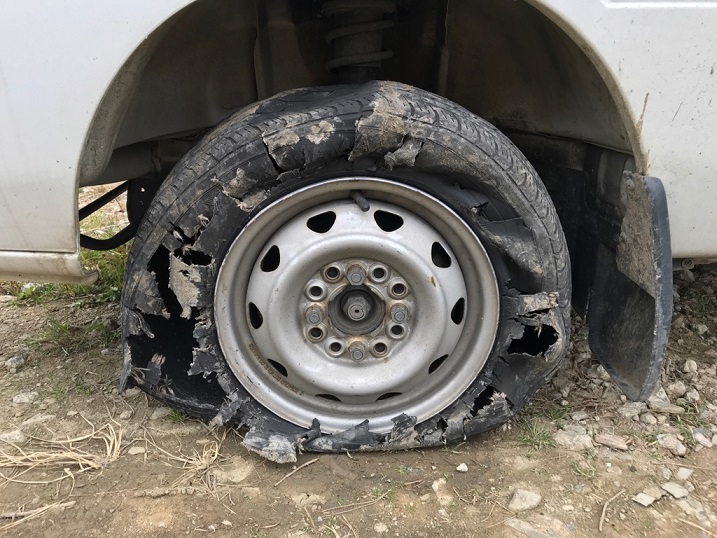 タイヤが酷いことに・・・ 道具作り研修会で会員が来店予定・・・そんな中、長女を送るべく河童七号機を走らせていると前走車がなにかを避ける・・・そこで気が付き回避行動に・・・が、余計な作業になった!!並トタンの破片が助手席側のタイヤに直撃!!酷い・・・・・