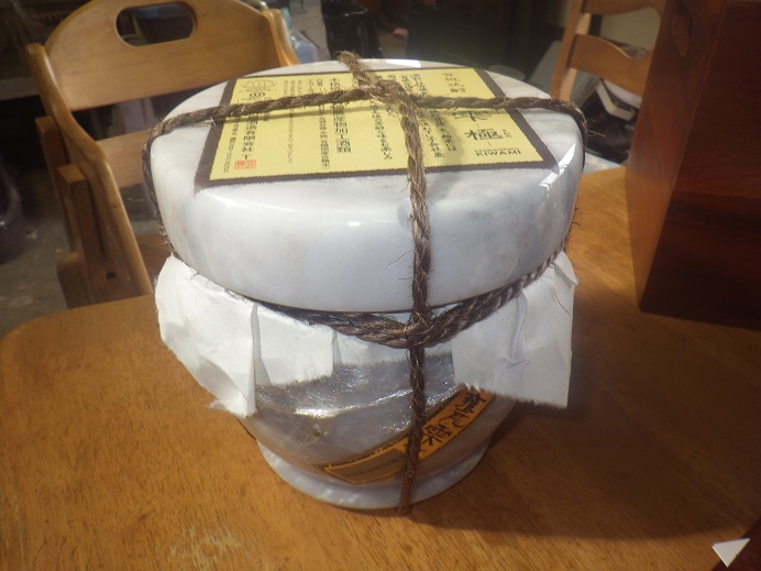 甕雫「極」を開ける 真野会員夫妻が見えたので、先日頂いた亀雫を開けることに・・・最近は長男も飲みに参加するので、飲める人(真野会員の奥さんは車の運転なので飲めず)は4人と言うことで・・・美味い、と言うかスッキリ・・・なんと言うか透明感!!ただ、この大理石(本物らしいが)の甕ってどうするの???重いし、中途半端な大きさだし・・・木箱は釣り具でも入れて、釣り場では椅子にして・・・・が合いそうですが、甕は・・・・
