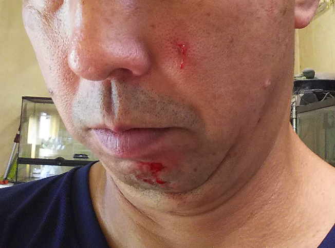 風が強めの悪いコンディションの中、大緒を忍縄に変えて渡りの調教へ・・・ Tパーチに乗せようとするが足離れが悪く一苦労・・・挙句に離れようとした所、拳に・・・ 一瞬、口餌が遅れた・・・瞬間、顔に・・・・ 4本の爪が唇下、あご、左のあご、左の頬骨付近に掛かりました。 かみさんも居ないので、どう外すか考えましたが、幸い身寄りの足はグローブの端にあったため、手先の足のみなので、右手でゆっくり外せました。 再度、力を籠めなかったのも幸い!