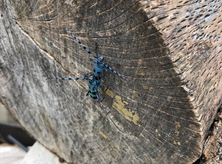 ルリボシカミキリ大量飛来 一匹のルリボシカミキリを捕まえてから、毎日のように同じ場所で別個体を見かけるように・・・・見かける場所と言うのが、ストック場の前に置いたクヌギの丸太の上!!この丸太は2年前の冷凍室設置時に電柱を立てて電線を引き直したのですが、その折に電線に掛かる枝を切り落したもの・・・・それを2本ほど置いといてもらったものです。良い感じに樹皮が落ち、サルノコシカケ?が生えて、朽ちている!!ひっくり返すとカブトムシも居ました11