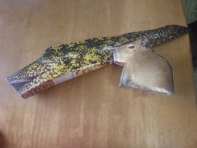 頂き物 来店したF氏から頂き物です!蒲郡の頑張っているちっさい水族館の限定お菓子・・・以前にもオオグソクムシせんべい貰ったんですが、今回はウツボとカピバラの・・・