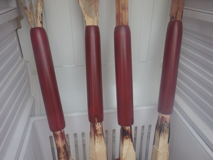 朱(赤)も塗ってみた! 昨日昼過ぎに頼んだ漆が、もう届いた。すぐに確認し、昨日削った忍縄筒に塗ってみた!少し色が深いか!?朱(赤で購入)と言うよりはあずき色っぽい!!まぁ、これはこれで良さそうなのだが・・・・朱はもっと橙色っぽく、今回は赤にしたんですが、他にも昔ながらの「弁柄/べんがら」もあります。色見本だと、良く判らず、やはり塗ってみないと・・・