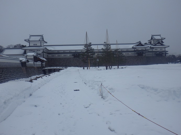 金沢城実演・・・1 この雪の中です・・・まだ降っています!!!ただ昨日と違い風は止んでいます!!風がないだけ、どんだけ良いか!