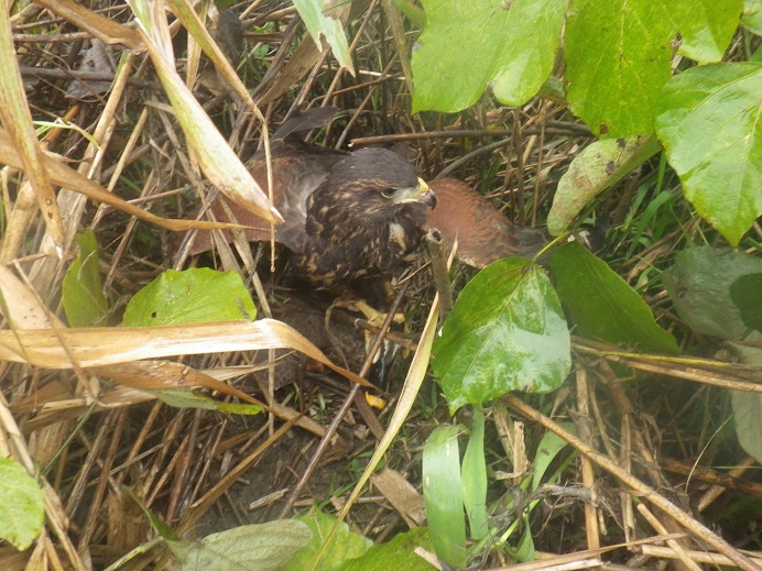 まぁ・・・ 今日もハリスホーク兄になんか獲らそうと奔走・・・結果的に細い川で運良く・・・絡んで落ちた対岸の草むらで、カルガモともども草に絡んだ格好で・・・