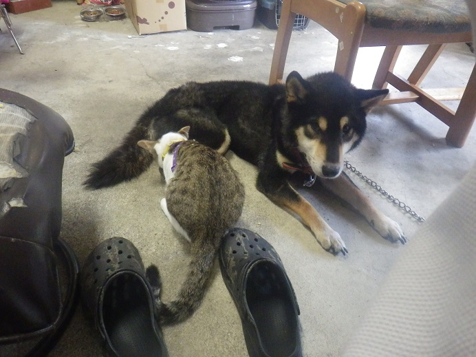 てつにとっては 足元にじゃれつく一松はうっとおしい存在!でも、なんやかんやと受け入れているようで・・・唸っても、絶対に咬みません。まぁ、でもうっとおしいんだろうなぁ・・・・!?
