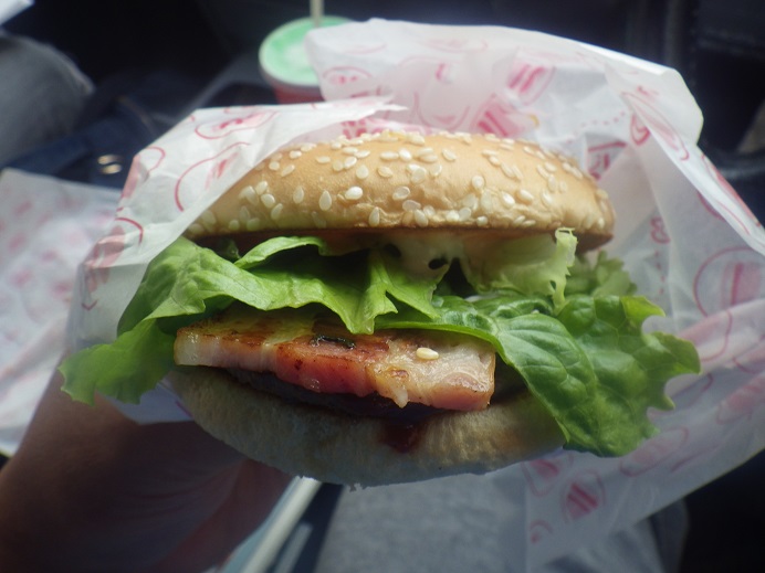 ドムドム〇ーガーって知ってる!? 日本ではマク〇ナ〇ドより前からあると言われるハンバーガーチェーン!!けっこうあちこちにあったんだけど最近はほぼ見かけません。桑名駅前には、昔から・・・いまでもちゃんと営業しています。東海地区はここだけらしい!!・・・で、ひさびさにかみさんに買ってきてもらい食べてみました!「ベーコンレタスバーガー」美味いです!!
