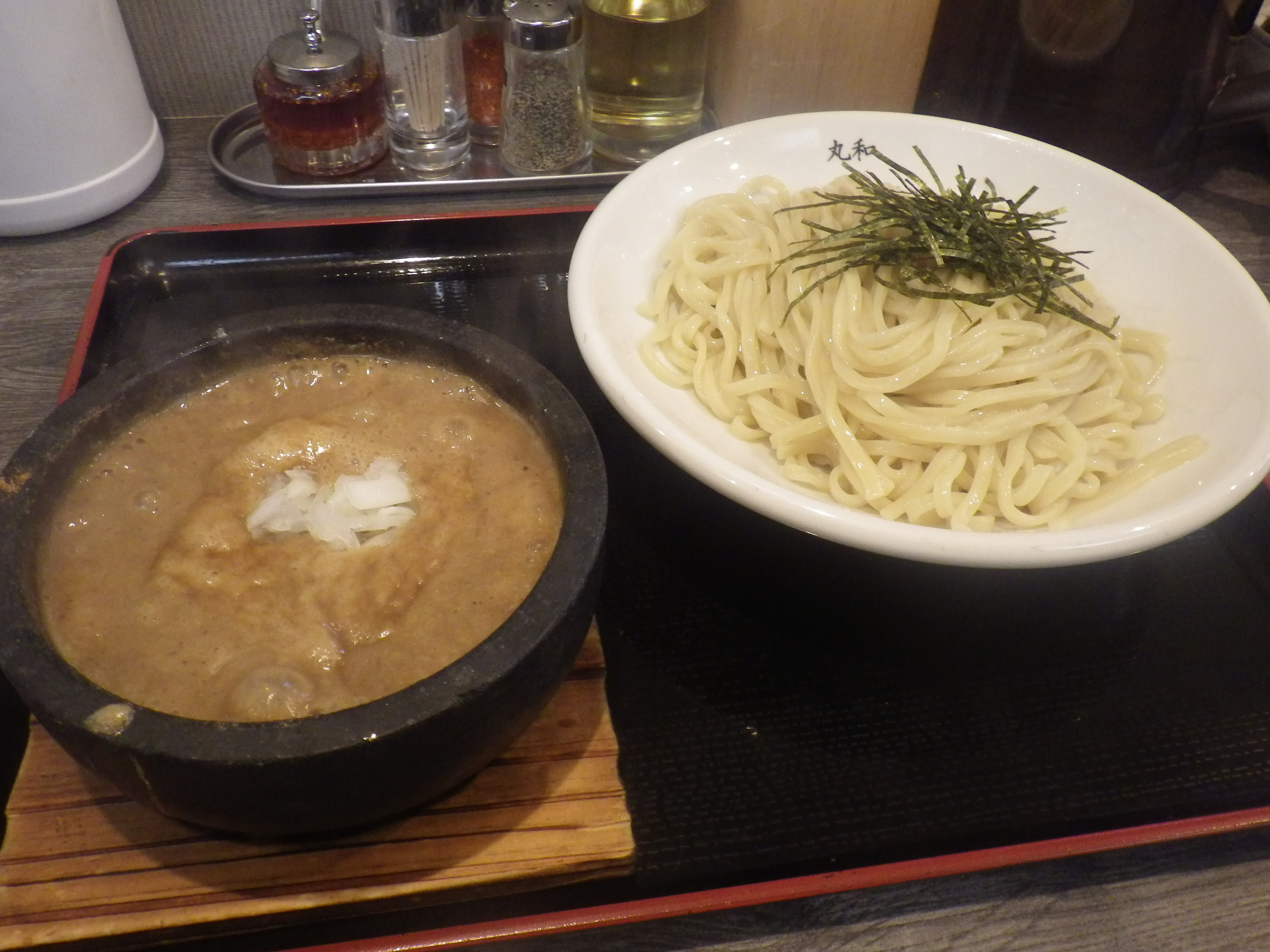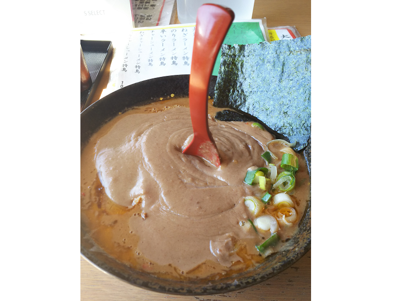 車の中古部品を受け取りに行くついでに、日本一濃いと言われる○岩亭の豚骨ベースのラーメン・・・の中でも一番濃い「特鳥」を食べてきました。 40分前で11番目・・・ 11時のオープンには、狭い駐車場がグチャグチャで店主が交通整理でラーメンを作れず・・・ 一杯目が出たのが20分後位くらいで、4杯目には最初の客が帰るくらいのペースで、私に提供されたのは11番目にもかかわらずオープン1時間10分後・・・都合2時間近く待たされました。 出てきたラーメンはご覧の通りの超濃厚スープ!