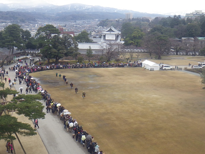 金沢城実演・・・輪回り 足元はグチャグチャ・・・です。歩くたびに水が飛びます。まぁ、覚悟のうえで来ていますから、仕方ないのですが・・・これから実演を始めます。