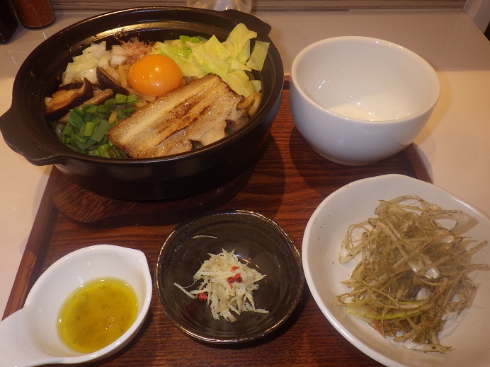 仕入れの関係で出たのですが、オープン30分前に到着してしまい、少し車で待ちましたが、その後は学生さん達が来たので、寒風吹きすさぶ中、外待ちです。 やっと入れたら、電気ストーブの前で助かりました。 カウンターに座っている人は、ほぼ限定でしたので、早く来て正解でした。 提供までかなり時間が掛かりましたが、出てきたのはアツアツで、鍋焼き風・・・ ブログによると郡上みそベースの味噌ダレだそうですが、ピリ辛で美味い!! 途中で3種類の薬味を加えるのですが、右のはコショウ?(黒七味だそうです)がまぶしてあるネギ、左のひとつはオリーブオイルとレモン?(柚子だそうです)の混ぜたの?、真ん中のひとつは不明、見た目も、そのまま喰っても判らん、生姜っぽいが嫌な風味(摺りは良いが、触感が嫌いでややダイレクトな風味も苦手)がしない気が・・・(正体は針生姜だそうです) 大盛でしたが、あっと言う間に完食!! 残ったタレやミンチなどをおかずにご飯を頂き、満腹になってお店を出ました。