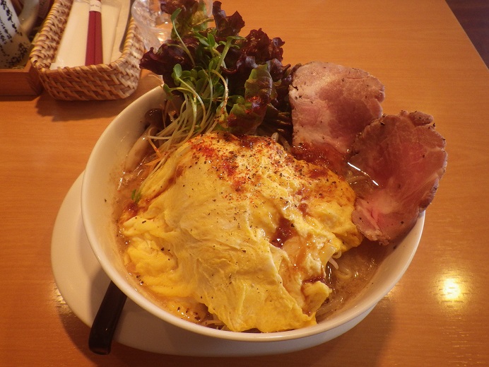 ちなみにここはオムライス専門店でラーメンも出しているお店・・・と言うことです。 ですので、かみさんを盾に入店・・・隣は女子高生三人組、カウンターには若いカップル・・・ですが、男性一人客やあとからは男性二人組もみえたので、普通の恰好ならは入れるか・・・なぁ???