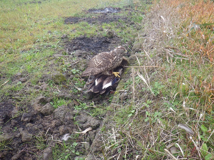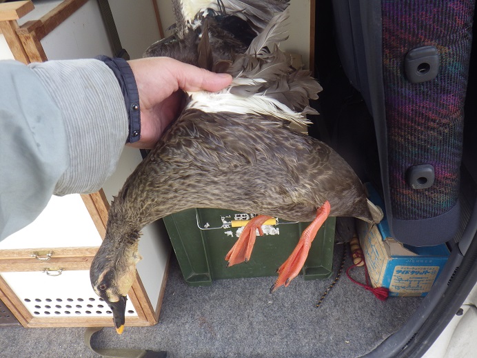 今日は、幅7〜8m、高低差2.5mほどの川で、斜めに飛び立ったカルガモ3羽に思いっきり「羽合せ/あわせ」ました。 そして3羽のうちの1羽に追い付き、競り上がりながら足を出し、両足を掴んで対岸へ・・・要はエアーキャッチ! 掴み替えながら落ちていったので、放されている感じはありませんでした。 ですので、ゆっくり据え上げに行きました。 今回はかなり良い獲り方、理想的な獲り方だったので「頭上げ/かしらあげ」をして、しっかり喰わせました!! ここ最近、いろいろで喰わせていなかったので、まぁ・・・☆☆73.9