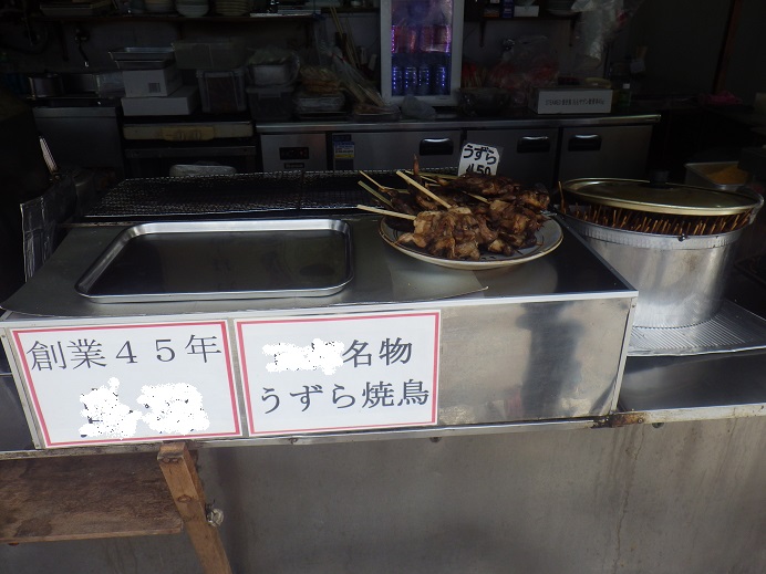 うずら!? 食事を終えて帰る途中のお店ですが、ここは「うずら」の焼鳥が・・・ただ以前に「すずめ」とされていた焼鳥には私から見れば明らかにニワトリの「ひよこ」だったので、果たして本当に「うずら」なのか疑ってしまいます。ごめんなさい!