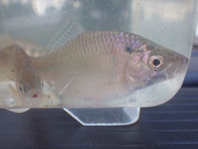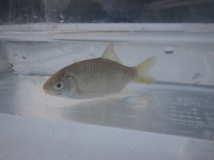 銀燐ヤリタナゴショートボディ 2つ目の川では、ヤリタナゴ、カネヒラ、アブラボテ、タイリクバラタナゴで30匹程度を・・・その中に銀燐の少し入ったショートボディのヤリタナゴが・・・背骨も曲がっておらず、綺麗に背びれから尾びれにかけて短くなっていました。