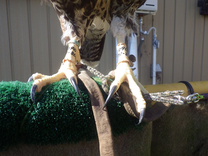 足革交換 ハリスホーク 弟(♀)は今後のことを考え、足革の交換とバックパックの取り付けを行いました。名前も考えんといかんしなぁ〜東雲は日に一回のフライトを2回に増やしました。