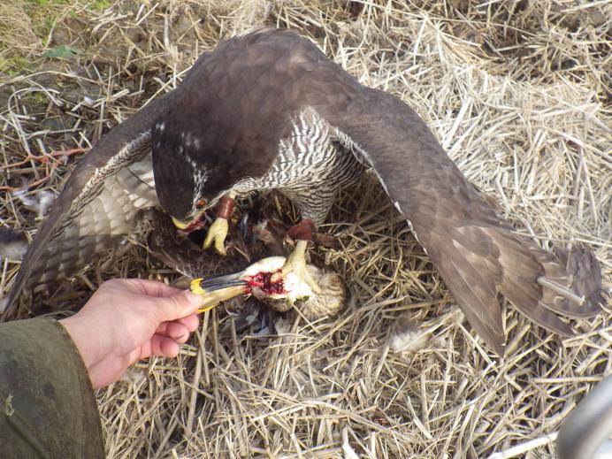 さらに少し町場で狩りをしていたところ、近所の方にとがめられ、警察を呼ばれてしまいました。 もちろん、私達としては、鳥獣保護区等位置図で場所の確認は行い、周辺にも配慮して行っていましたが、遅い食事をされていたその方は窓から見ていて驚いたそうです。 警察の方々も最初から問題ないことをその方(住民の方)に話し始めましたので、私達は住所氏名を聞かれ、鳥獣保護区等でないことを再確認して終わりました。 私達は、鳥達の調教は他人やペットなどの危険がないよう行っていることや、100%安全はありえないので、もしもの為に個人損害賠償責任の保険に加入していることも話しました。