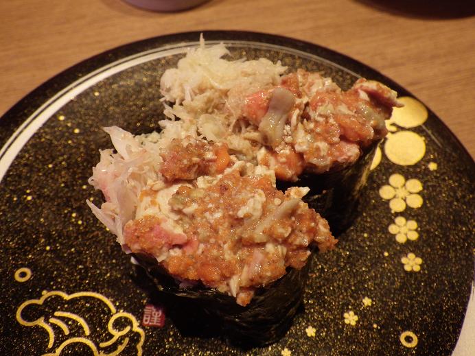 石川にて・・・2の2 季節に入った越前ガニ、つまりズワイガニですが・・・これは地元の人が大好きなメス・・・石川では「香箱ガニ/こうばこがに」と言いますが・・・その軍艦。内子がまた美味い!!これで贅沢は終わり・・・なんですが、週末は遠出が控えていますので・・・・太るかな???