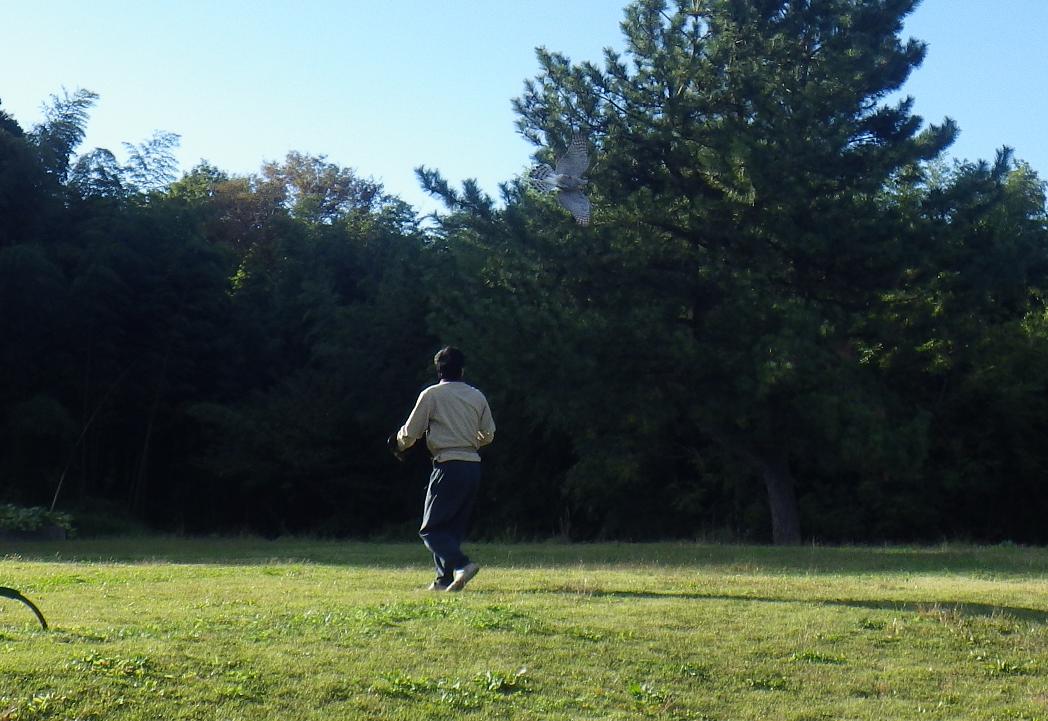 例によって 鷹匠補研修会は佐藤会員一人。「架/ほこ」に鷹を止める(大緒を結ぶ)方法やハトの準備、忍縄の使い方などを・・・自分の鳥達の調教は、まぁいつも通り・・・
