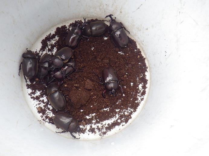 羽化しました! 昨年、次女の飼っていたカブトムシが産卵、2度ほどマットを変えた程度の世話で10匹(うまいこと5ペア)羽化しました。月曜日には保育園に貰われていくことでしょう。