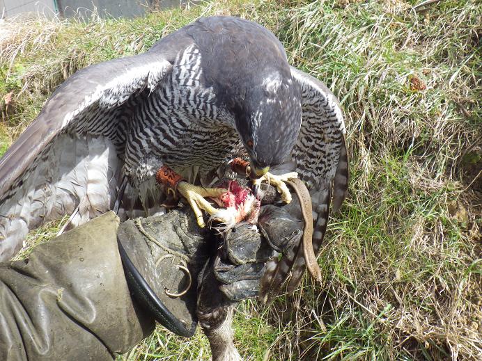 GBスパ(ゴスブラ)の神滝は2010年生まれのメス個体、オオタカのオスの精子をブラックスパロウホークのメスに入れて出来たハイブリッドでハンドレアード個体です。 私のやった個体、私なりのやり方(諏訪流+)での比較ですが、オオタカより気性の変化が激しく、行く時は行く、行かない時は行かない。要は神経質だが切り替わりが早く、獲物(覚えた&シアミの出た。)やエサへの集中度は高い。 行きたい時は、輸送箱でも激しく暴れて出たがる。 ・・・ので、尾羽はもちろん初列も傷みやすい。(これは1年目と2年目の話です) なので、出し入れの激しいカモ狩りより、据えて歩くキジ狩り向き・・・が、神滝2年目までの私が受け取る感じ・・・ ですが、今年は飛礫でキジを・・・と考えていて、それなりに対処をしてやってきたつもりなんですが、どうにも飛礫はキジを追う気がない。キジに対するシアミが出せない。また、繁殖用なので2年で結果を出して、終わるのが最初の予定でしたので今期で終えるつもりでした。 ああだ、こうだと書きましたが、要は飛礫でキジを獲るのをあきらめたので(負けました)、猟期最後に神滝でキジを・・・と、正月から詰め始めたわけです。 それが案外、肉色が下がらず、ズルズル押してきたので、今に至ります。 飛礫もここまで引っ張り、なおかつ実演もあるので、猟期最後まではやるつもりですが、まぁキジは神滝に任せます。 もちろん、神滝とてキジとの良い出会いがあれば・・・でしょうし、飛ばし始めて日が浅い為、飛びはまだまだですし、神滝なら獲れるなんて思っていませんが・・・