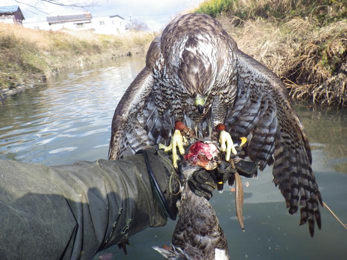 「羽を組む」翼を交差させるんで、見た目は可哀想ですが・・・ 「獲物の羽ばたきで鷹を嫌がらせない」「無用に獲物が暴れて傷を深めない、増やさない(獲物が暴れると鷹も持ち替えたりするので・・・)」為には必要な技術です。鷹匠認定試験での据上げ時も行う技術です。 短時間なら獲物のダメージは有りません。外せば普通に飛びます。
