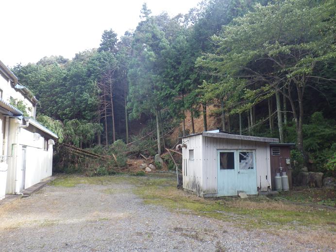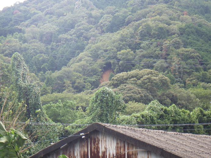 台風の影響だ! 河童の裏山・・・と言っても、国道挟んで反対側。「水晶の湯」の南側の斜面!!崩れています!!・・・たぶん!?