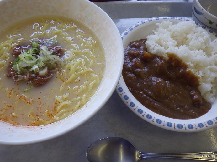 社員食堂 有害鳥獣駆除のお取引先にて社員食堂の利用が可能と言うことが判り、利用しました。とんこつラーメン(辛みそで)¥160半カレー¥100「腹一杯!」たまには良いですね!!