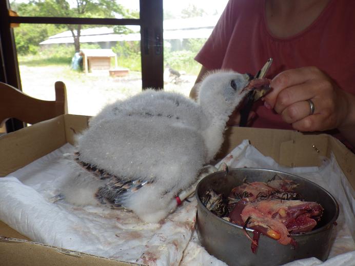 オオタカ 今期は人工授精でのオオタカのヒナは現在3羽!自然繁殖は1羽人工授精の結果待ちはまだあるにはあるが、期待薄!?でも、一昨年より昨年、昨年より今年・・・と、まぁ順調に結果は出てきました。しかし、不安要素も・・・それは次世代の人工授精用のオスの確保!こればっかりは・・・・・・で、この子は候補の1羽です。吉田鷹匠が今期この子を調教する予定・・・あくまで予定なので、変更はあるかも!???