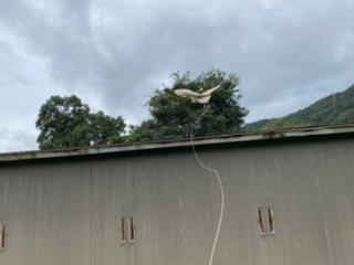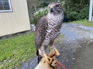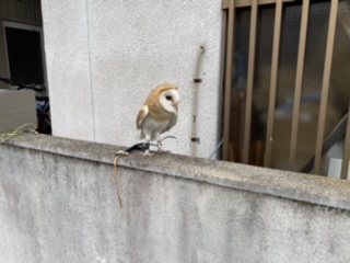 自宅前 今日は中学校の土曜授業、授業参観だったので午前中、自宅にてメンフクロウ「たけのこ」の訓練。とりあえずいつもと違う場所、ご近所さんの見学有りでもいつもの反応だったのでホッとしました
