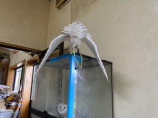 ハジメテ 昨日室内でちょっと上のほうにとまらせたりしたからか今日初めて屋根の上にとまりました