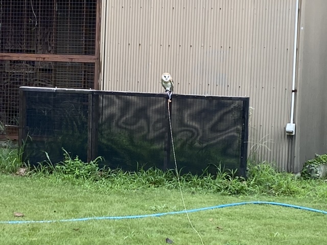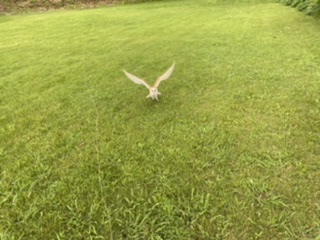 墜落 芝生いっぱい飛んでくるようになったメンフクロウさんですが離れたがらないのでパーチにおろしてからは私、全力疾走で離れますが、私に体力がないのでよく背中に張り付かれます…ただ、メンフクロウにもまだ体力がないので追いつかれる前に地面に降りちゃったりします