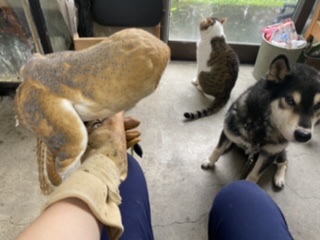 集まる 犬猫たち...メンフクロウを据えていると、犬は餌をこぼさないかと?、猫はメンフクロウが気になって?周りに集まってきます。写真ではそっぽ向いてる猫もチラチラとこっちをうかがっているし、スマホを出すまでは犬も足元ウロウロしていたし...