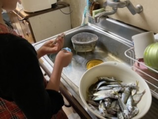 楽しんだ後は 某アニメのおかげで去年から小アジの処理は三女も手伝ってくれます。