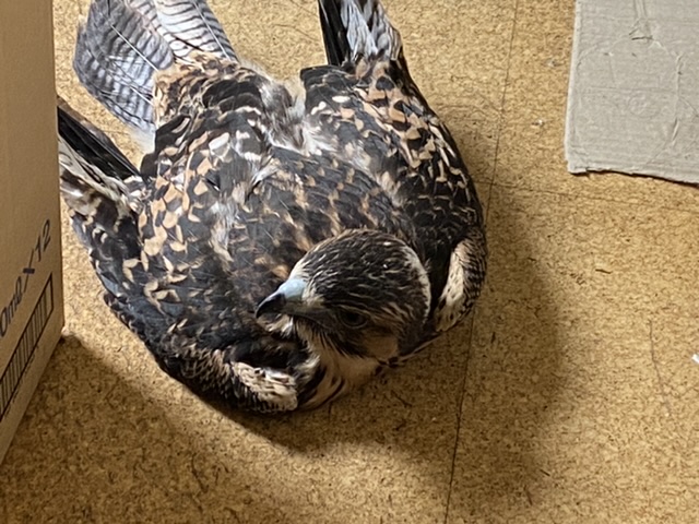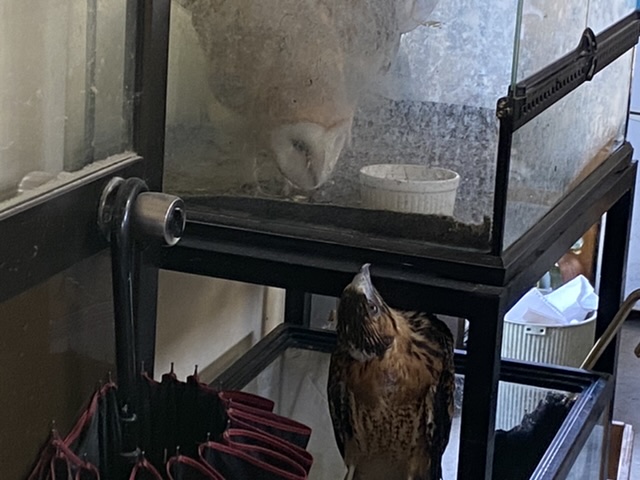 お見合い はじめて水槽の縁に登ったセアカノスリ上のメンフクロウにとっては初めて見る鳥お互い興味津々...?