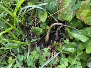 ヤマイモ ムカゴを拾ってきてその辺に放置してたらツルが伸びてきて、それもほっておいたのですが伸びたツルに足をひっかけて根元を引っこ抜いてしまいました。見るとちっちゃなヤマイモが出来ていました。ちゃんとムカゴで増えるんだねぇ…