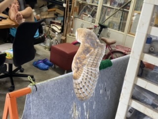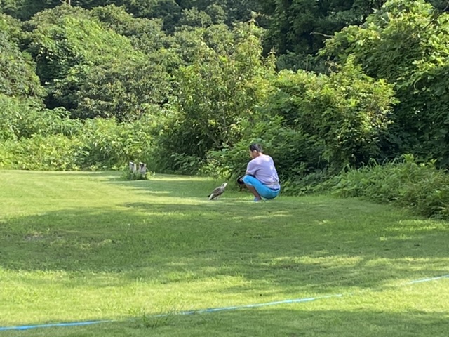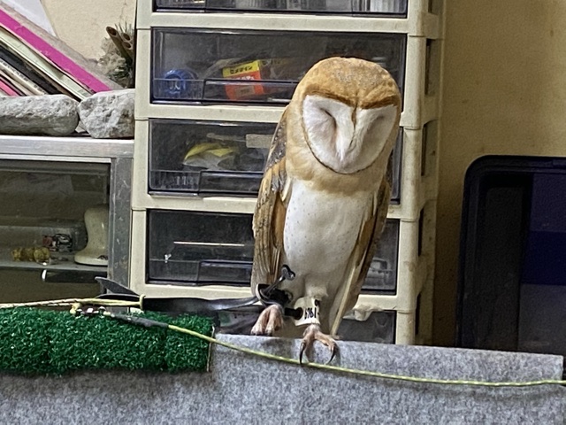 繋がれて 繋がれていることにも慣れました。餌合子で餌を食べることを覚えました。次は据えられることになれてもらいます。