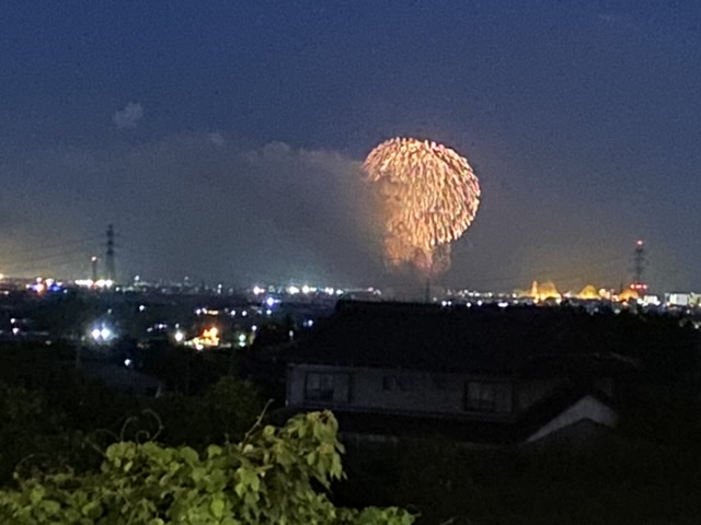 3年ぶり の花火娘のバイト先からも見えました煙がこちら向きなのが残念...